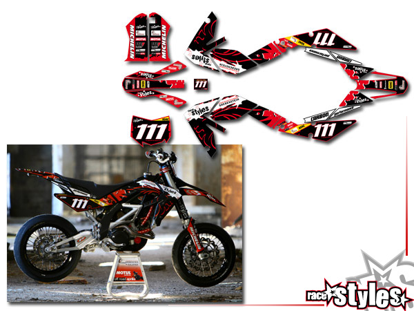 Description: LTD.-Edition full graphic KIT for APRILIA SXV / RXV / MXV / 450-550 models. This kit includes the following decals: fork protectors le./ri., fender front/rear, rad covers le./ri. and a full number plate kit.