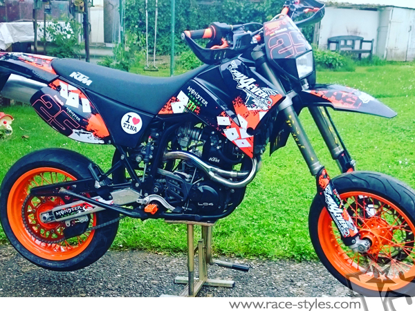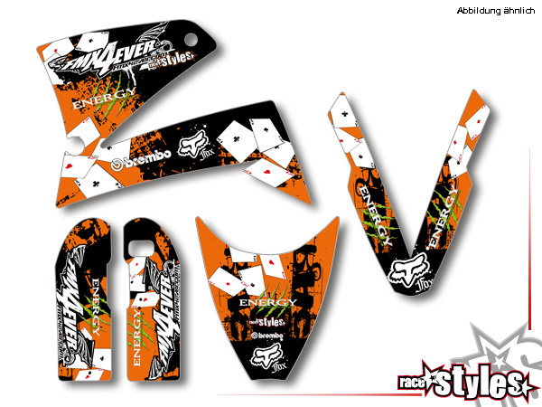Beschreibung: Mulisha-FMX Basic Dekor-Kit passend für KTM LC4 - SXC / SM / SMC / DUKE 620-660 (1998-2007) bestehend aus Gabel li./re., Kotflügel vo./hi. und Kühler li./re.