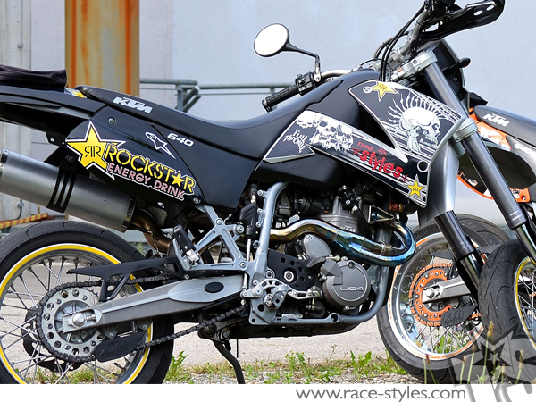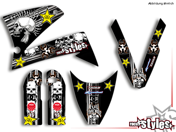 Description: Skull-FMX basic graphic-kit for KTM LC4 - SXC / SM / SMC / DUKE 620-660 (1998-2007). This kit includes the following decals: fork protectors le./ri., fender front/rear and rad covers le./ri.