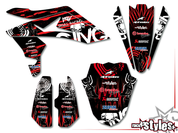 Description: Skull-FMX basic graphic-kit for HUSQVARNA SM / SMR / WR / WRE / CR / TC / TE models 2000-2013. This kit includes the following decals: fork protectors le./ri., fender front/rear and rad covers le./ri.