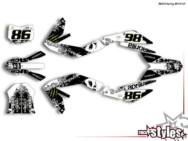 Description: Brandings full graphic KIT for APRILIA SXV / RXV / MXV / 450-550 models. This kit includes the following decals: fork protectors le./ri., fender front/rear, rad covers le./ri. and a full number plate kit.