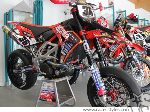 Description: full graphic KIT for APRILIA SXV / RXV / MXV / 450-550 models. This kit includes the following decals: fork protectors le./ri., fender front/rear, rad covers le./ri. and a full number plate kit.