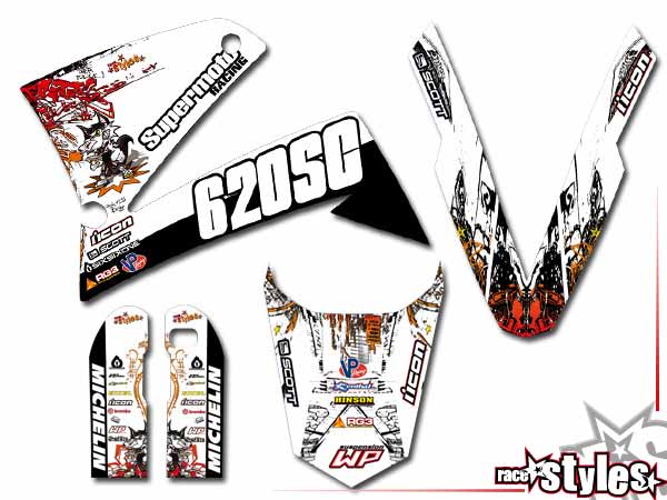 Beschreibung: Graffiti-FX Basic Dekor-Kit passend für KTM LC4 - SXC / SM / SMC / DUKE 620-660 (1998-2007) bestehend aus Gabel li./re., Kotflügel vo./hi. und Kühler li./re.