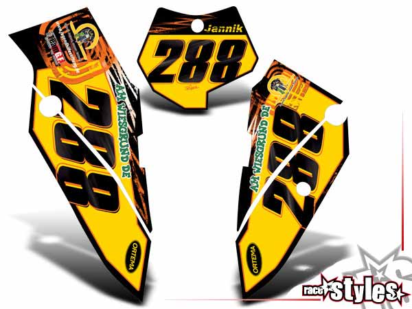 Description: Factory-MX number plate decal kit for KTM SX50 2002-2015 / SX65 2000-2015 / SX85 2000-2012. Airbox graphics le./ri. are included.