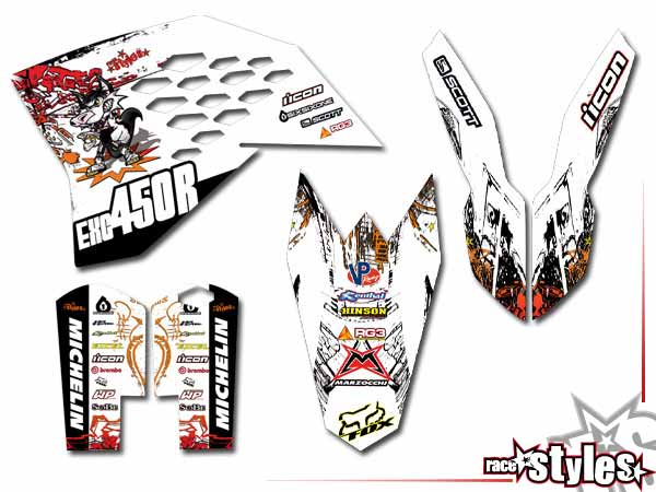 Description: Graffiti-FX basic graphic-kit for KTM SX / SX-F (2007-2010) and EXC / EXC-F / SMR (2008-2011). This kit includes the following decals: fork protectors le./ri., fender front/rear and rad covers le./ri.
