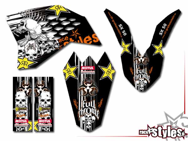 Description: Skull-FMX basic graphic-kit for KTM SX50 2002-2015 / SX65 2000-2015 / SX85 2000-2012. This kit includes the following decals: fork protectors le./ri., fender front/rear and rad covers le./ri.