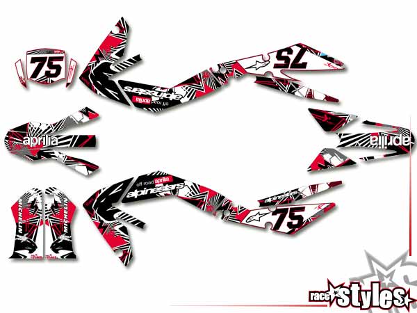 Description: Newline-LTD. full graphic KIT for APRILIA SXV / RXV / MXV / 450-550 models. This kit includes the following decals: fork protectors le./ri., fender front/rear, rad covers le./ri. and a full number plate kit.
