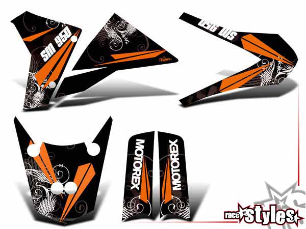 Description: basic graphic-kit for KTM 950 SuperMoto 2006-2008. This kit includes the following decals: fork protectors le./ri., fender front/rear and rad covers le./ri.