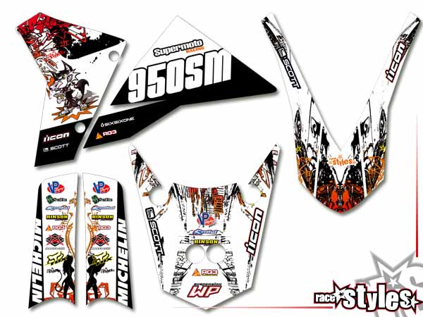Description: basic graphic-kit for KTM 950 SuperMoto 2006-2008. This kit includes the following decals: fork protectors le./ri., fender front/rear and rad covers le./ri.