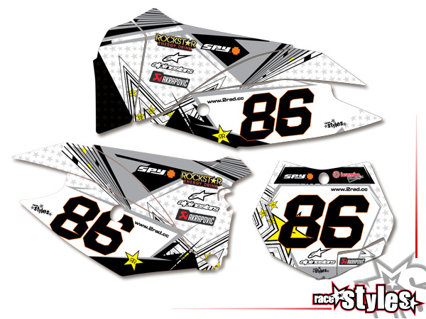 Description: Silver-LINE number plate decal kit for KTM SX / SX-F (2011-2012, 2013-2015) and EXC / EXC-F / SMR (2012-2013, 2014-2016). Airbox graphics le./ri. are included.