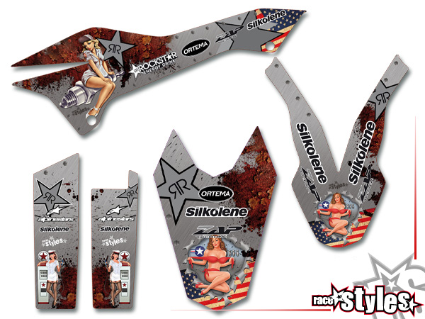 Description: American-Way basic graphic-kit for KTM 690 SMC / SMC-R / ENDURO (2008-2017). This kit includes the following decals: fork protectors le./ri., fender front/rear and rad covers le./ri.