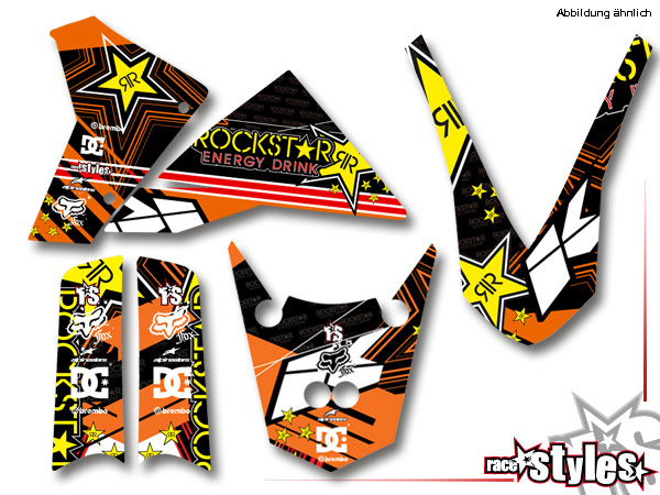 Description: basic graphic-kit for KTM 950 SuperMoto 2006-2008. This kit includes the following decals: fork protectors le./ri., fender front/rear and rad covers le./ri.