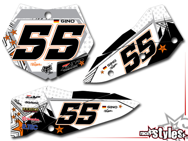 Description: Silver-LINE number plate decal kit for KTM SX / SX-F (2007-2010) and EXC / EXC-F / SMR (2008-2011). Airbox graphics le./ri. are included.
