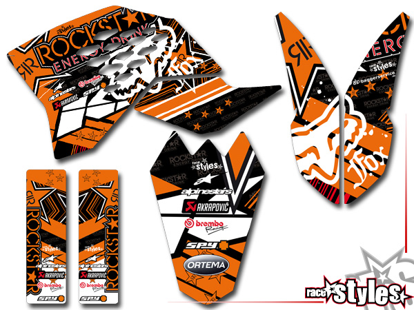 Description: Factory-MX basic graphic-kit for KTM SX50 2002-2015 / SX65 2000-2015 / SX85 2000-2012. This kit includes the following decals: fork protectors le./ri., fender front/rear and rad covers le./ri.