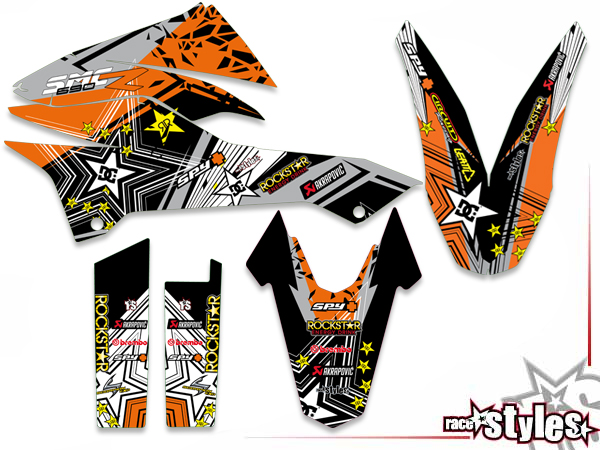 Description: Rockstar-MX basic graphic-kit for KTM 690 SMC / SMC-R / ENDURO (2008-2017). This kit includes the following decals: fork protectors le./ri., fender front/rear and rad covers le./ri.