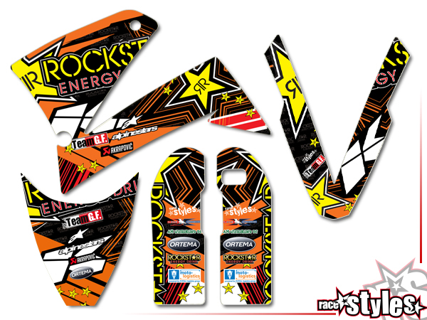 Beschreibung: Rockstar-MX Basic Dekor-Kit passend für KTM LC4 - SXC / SM / SMC / DUKE 620-660 (1998-2007) bestehend aus Gabel li./re., Kotflügel vo./hi. und Kühler li./re.