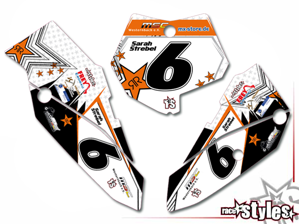 Description: Brandings number plate decal kit for KTM SX50 2002-2015 / SX65 2000-2015 / SX85 2000-2012. Airbox graphics le./ri. are included.