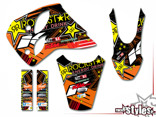 Description: basic graphic-kit for KTM LC4 / LC2 / DUKE / EGS /SXC 400-620 (1990-1997). This kit includes the following decals: fork protectors le./ri., fender front/rear and rad covers le./ri.