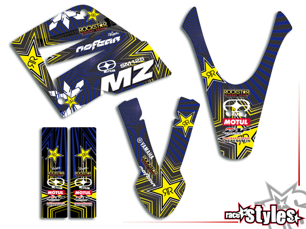 Description: Rockstar-MX basic graphic-kit for MZ / MUZ, RT 125 SX / SM, 2000-2008. This kit includes the following decals: fork protectors le./ri., fender front/rear and rad covers le./ri.
