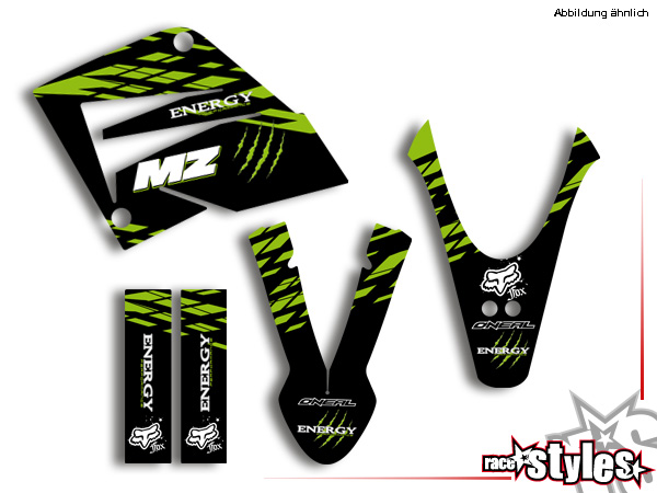 Description: AMA-LTD. basic graphic-kit for MZ / MUZ, RT 125 SX / SM, 2000-2008. This kit includes the following decals: fork protectors le./ri., fender front/rear and rad covers le./ri.