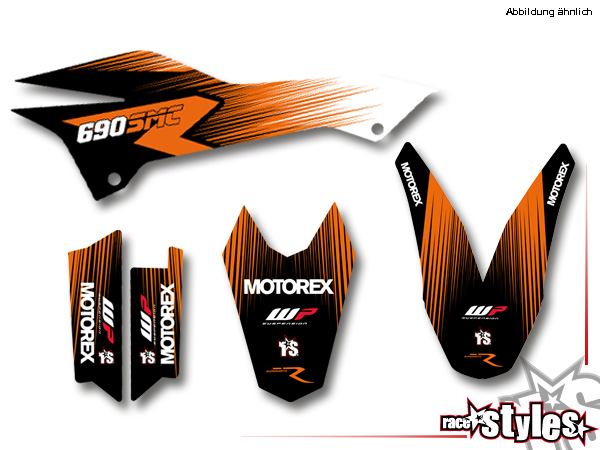 Description: Factory-SMCR basic graphic-kit for KTM 690 SMC / SMC-R / ENDURO (2008-2017). This kit includes the following decals: fork protectors le./ri., fender front/rear and rad covers le./ri.