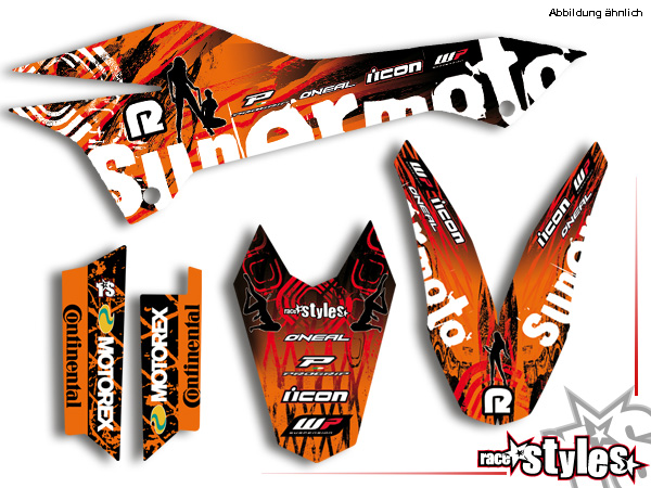 Description: Skull-FMX basic graphic-kit for KTM 690 SMC / SMC-R / ENDURO (2008-2017). This kit includes the following decals: fork protectors le./ri., fender front/rear and rad covers le./ri.