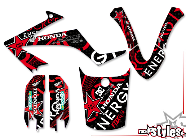 Description: basic graphic-kit for HONDA FMX 650, 2005-2007. This kit includes the following decals: fork protectors le./ri., fender front/rear and rad covers le./ri.