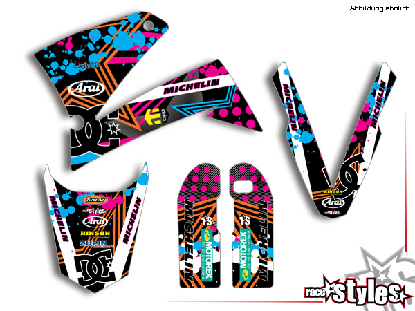 Description: basic graphic-kit for KTM LC4 - SXC / SM / SMC / DUKE 620-660 (1998-2007). This kit includes the following decals: fork protectors le./ri., fender front/rear and rad covers le./ri.