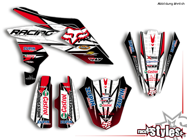 Description: ZUPIN-Edition basic graphic-kit for HUSQVARNA SM / SMR / WR / WRE / CR / TC / TE models 2000-2013. This kit includes the following decals: fork protectors le./ri., fender front/rear and rad covers le./ri.