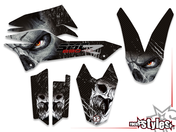 Description: R.I.P.forever basic graphic-kit for KTM 690 SMC / SMC-R / ENDURO (2008-2017). This kit includes the following decals: fork protectors le./ri., fender front/rear and rad covers le./ri.
