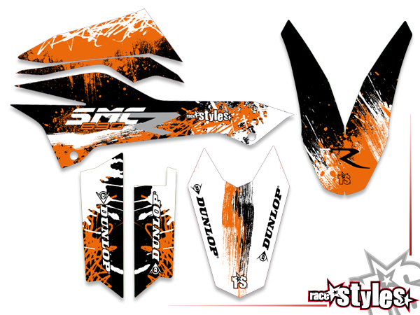 Description: Factory-SMCR basic graphic-kit for KTM 690 SMC / SMC-R / ENDURO (2008-2017). This kit includes the following decals: fork protectors le./ri., fender front/rear and rad covers le./ri.