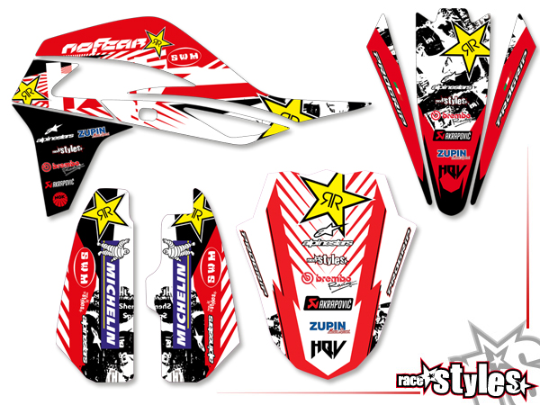 Description: basic graphic-kit for SWM RS 125, 300, 500, 650 R / SM 125, 300, 500, 650 R, 2016-2024. This kit includes the following decals: fork protectors le./ri., fender front/rear and rad covers le./ri.