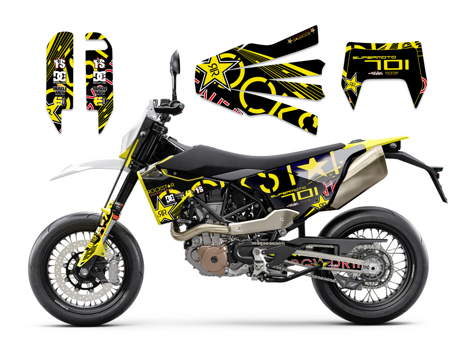 Description: Full decals kit for HUSQVARNA 701. This kit includes the following stickers: fork protectors le./ri., fender front/rear, rad covers le./ri., a full number plate kit and swingarm le./ri. in a ROCKSTAR design.