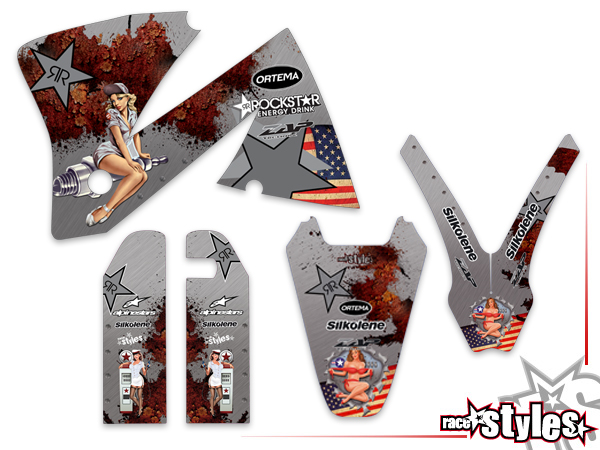 Description: American-Way basic graphic-kit for KTM SX / SX-F (1998-2006) and EXC / EXC-F / SMR (1998-2007). This kit includes the following decals: fork protectors le./ri., fender front/rear and rad covers le./ri.