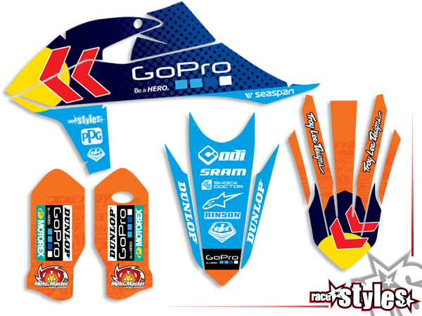 Description: basic graphic-kit for KTM SX50 2016-2024 / SX-E5 2019-2024 and SX65 2016-2024 / MC65 2021-2024. This kit includes the following decals: fork protectors le./ri., fender front/rear and rad covers le./ri.