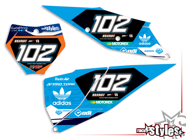 Description: number plate decal kit for KTM SX50 2016-2024 / SX-E5 2019-2024 and SX65 2016-2024 / MC65 2021-2024. Airbox graphics le./ri. are included.
