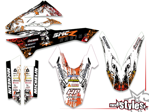 Description: Graffiti-FX basic graphic-kit for KTM 690 SMC / SMC-R / ENDURO (2008-2017). This kit includes the following decals: fork protectors le./ri., fender front/rear and rad covers le./ri.