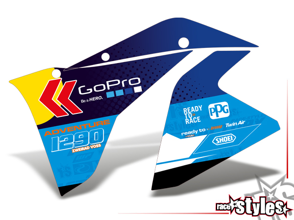 Description: rad cover graphics le./ri. for KTM Super Adventure 1290 models (2015-2020).