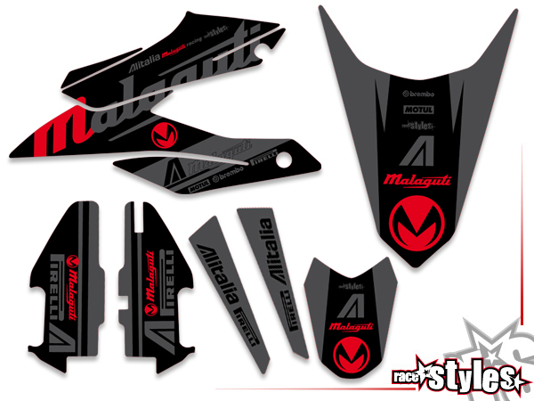 Description: basic graphic-kit for MALAGUTI XSM / XTM 125 2019-2025. This kit includes the following decals: fork protectors le./ri., fender front/rear, rad covers le./ri.