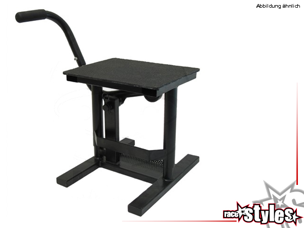 JMP central lift mechanical, ideal for Enduro and Motocross. Capacity max. 160kg. Width: 345mm. Depth: 275mm. Adjustable working height 300mm and 410mm. Weight: 6kg.