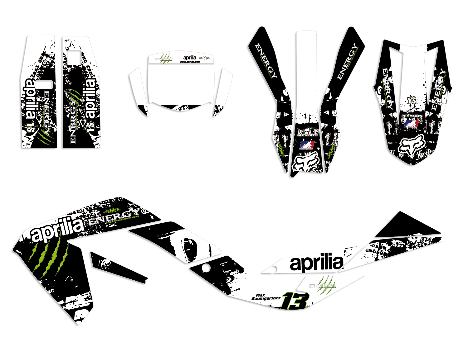 Description: Full decals kit for APRILIA SX / RX 50 - 125. This kit includes the following stickers: fork protectors le./ri., fender front/rear, rad covers le./ri., a full number plate kit and swingarm le./ri. in a MONSTER design.