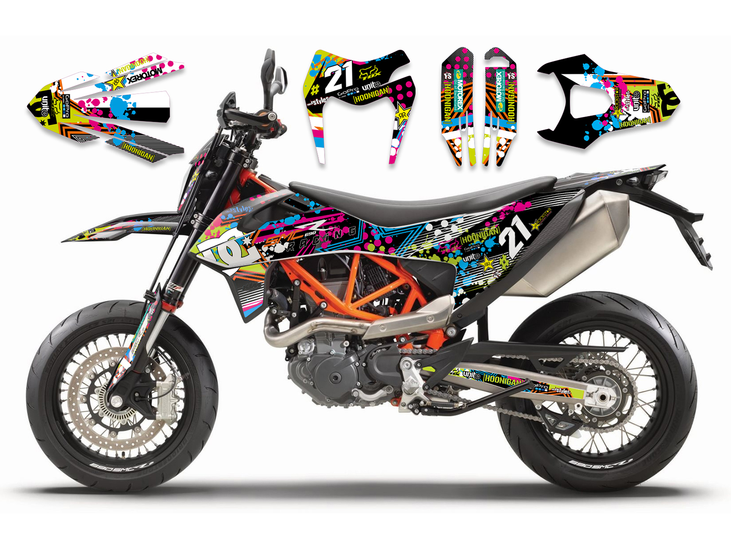 Description: Full decals kit for KTM SMC 690 R / ENDURO (2019-2024). This kit includes the following stickers: fork protectors le./ri., fender front/rear, rad covers le./ri., a full number plate kit and swingarm le./ri. in a DC-DOTS design.