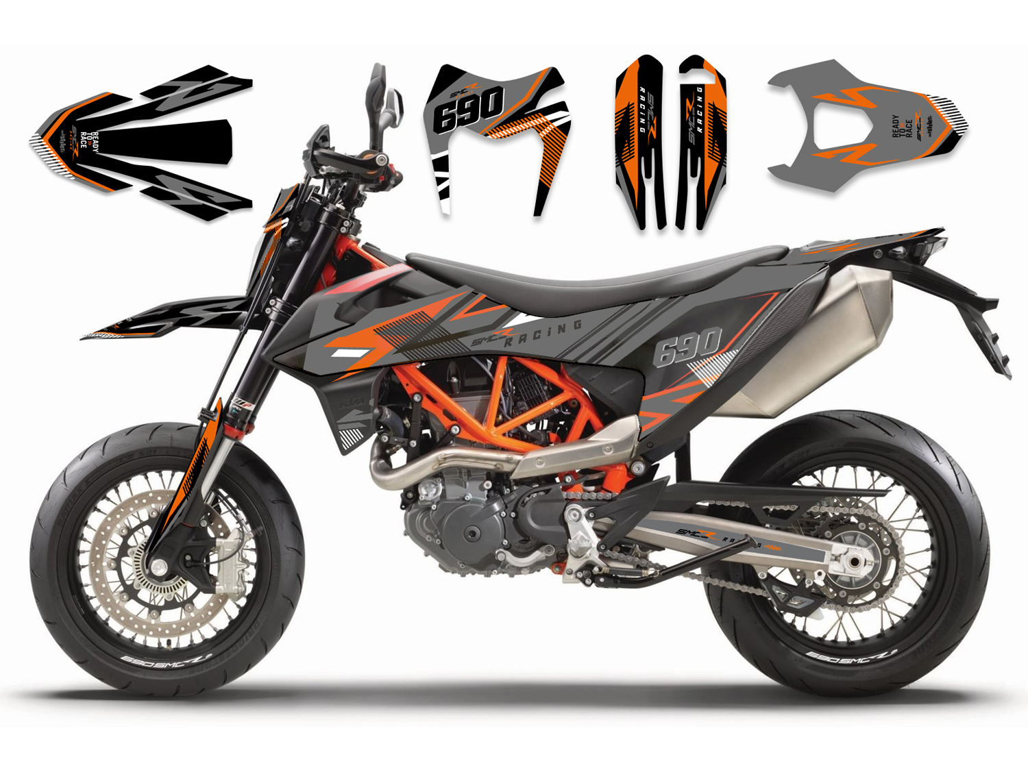 Description: Full decals kit for KTM SMC 690 R / ENDURO (2019-2024). This kit includes the following stickers: fork protectors le./ri., fender front/rear, rad covers le./ri., a full number plate kit and swingarm le./ri. in a FactoryGRAY design.