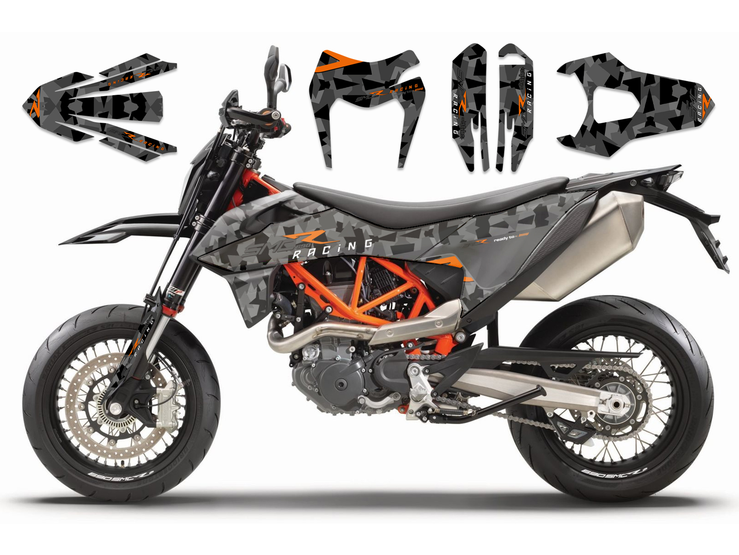 Description: kit déco complet pour modèles KTM SMC 690 R / ENDURO (2019-2024) comprenant bas de fourche gauche/droite, ouïes de radiateur gauche/droite, coques avant/arrière et fonds de plaque dans la conception CamoGRAY.