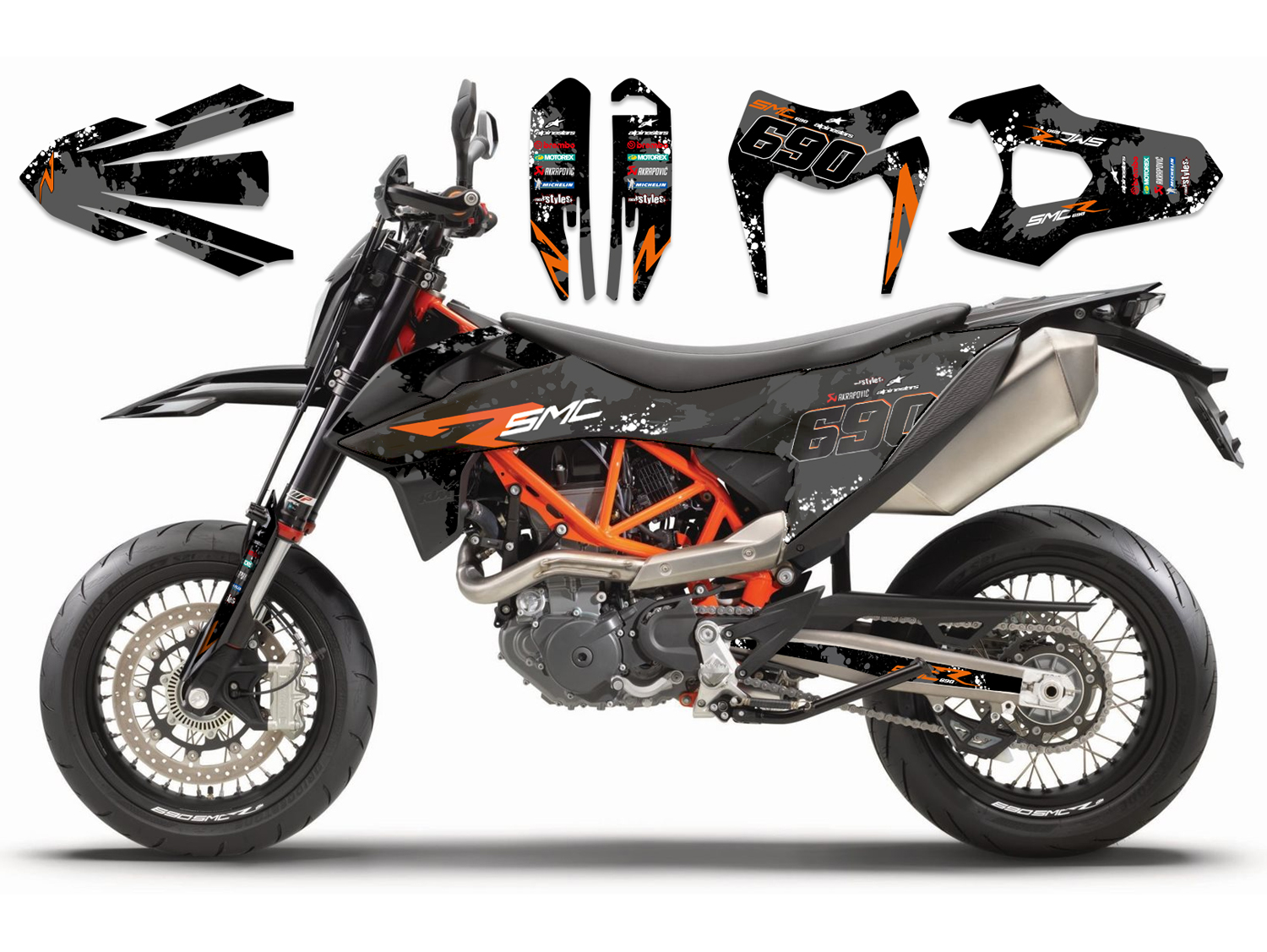 Description: Full decals kit for KTM SMC 690 R / ENDURO (2019-2024). This kit includes the following stickers: fork protectors le./ri., fender front/rear, rad covers le./ri., a full number plate kit and swingarm le./ri. in a GRAYsplotch design.