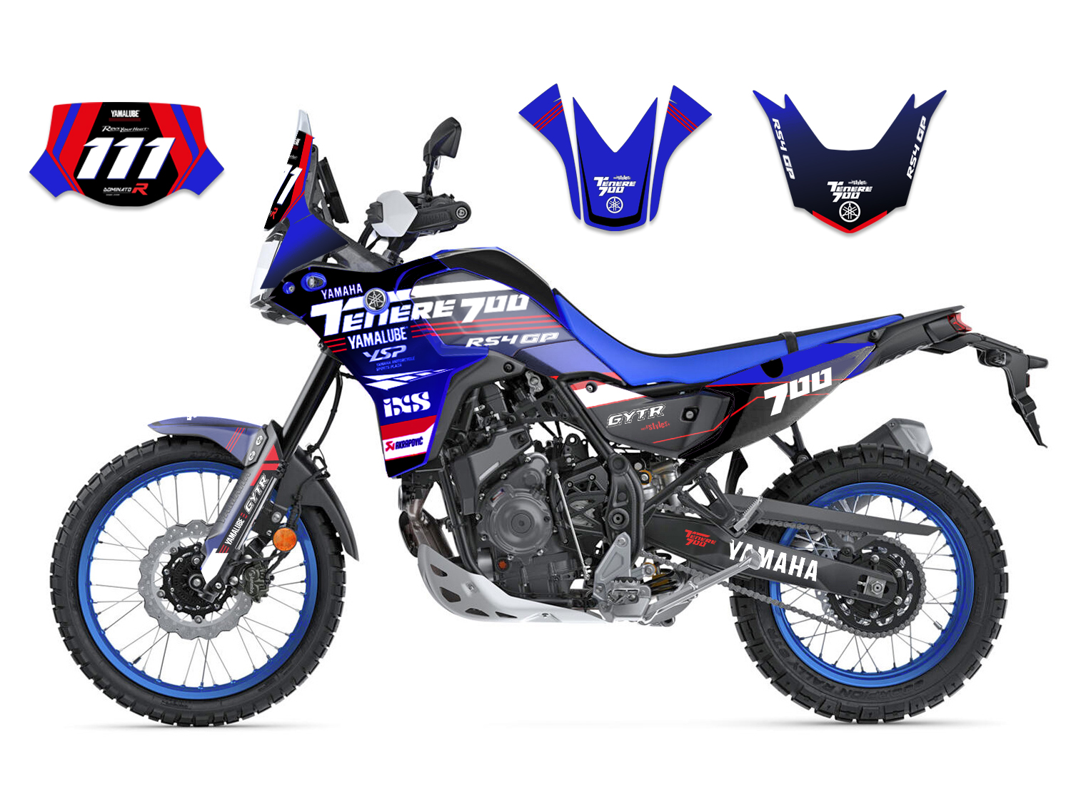 Description: Full decals kit for all YAMAHA Tenere 700, 2025 models. This kit includes the following stickers: fork protectors le./ri., fender front/rear, rad covers le./ri., a full number plate kit and swingarm le./ri. in a REVOLUTION design.