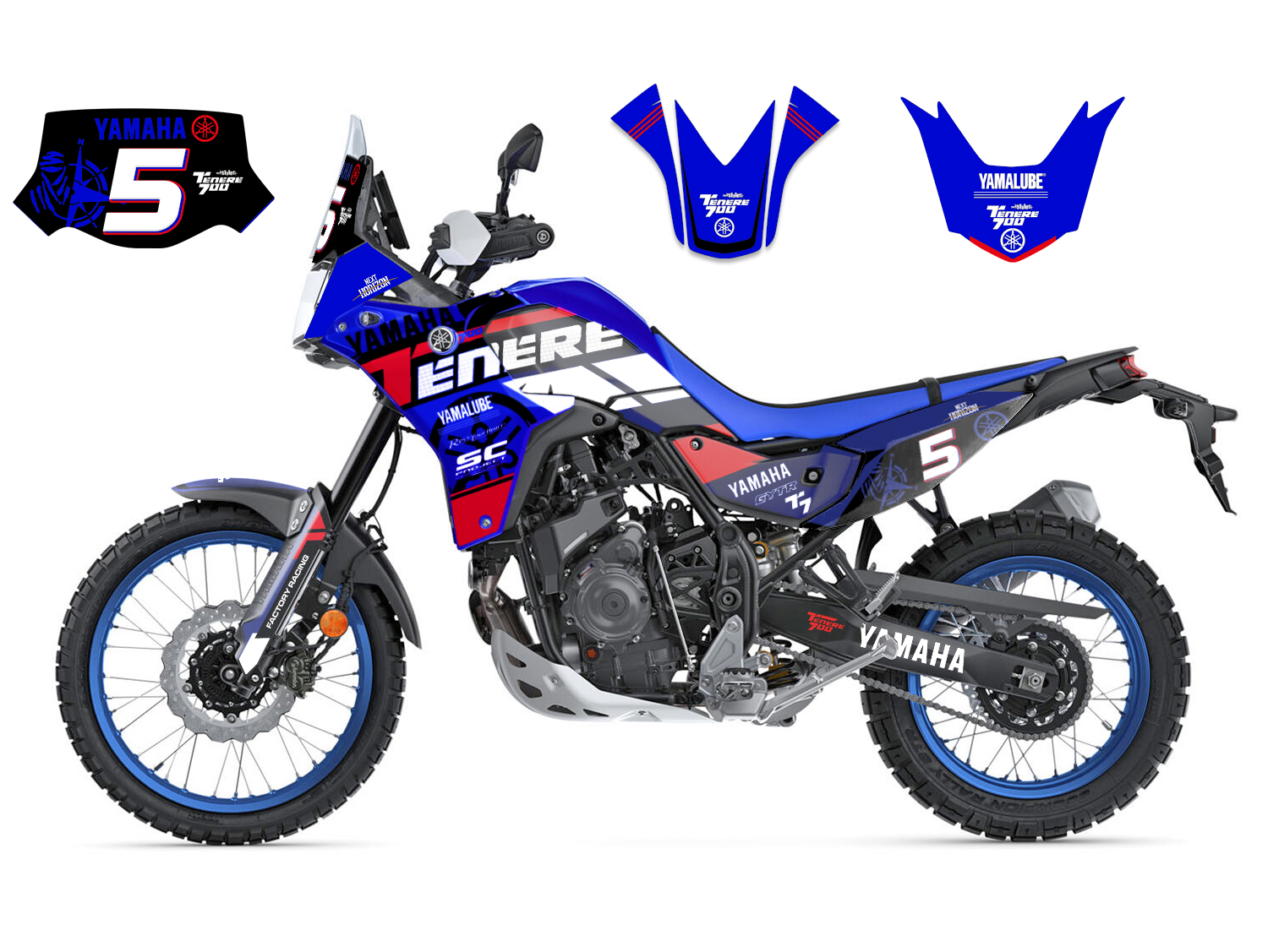 Description: Full decals kit for all YAMAHA Tenere 700, 2025 models. This kit includes the following stickers: fork protectors le./ri., fender front/rear, rad covers le./ri., a full number plate kit and swingarm le./ri. in a BlueRacing design.