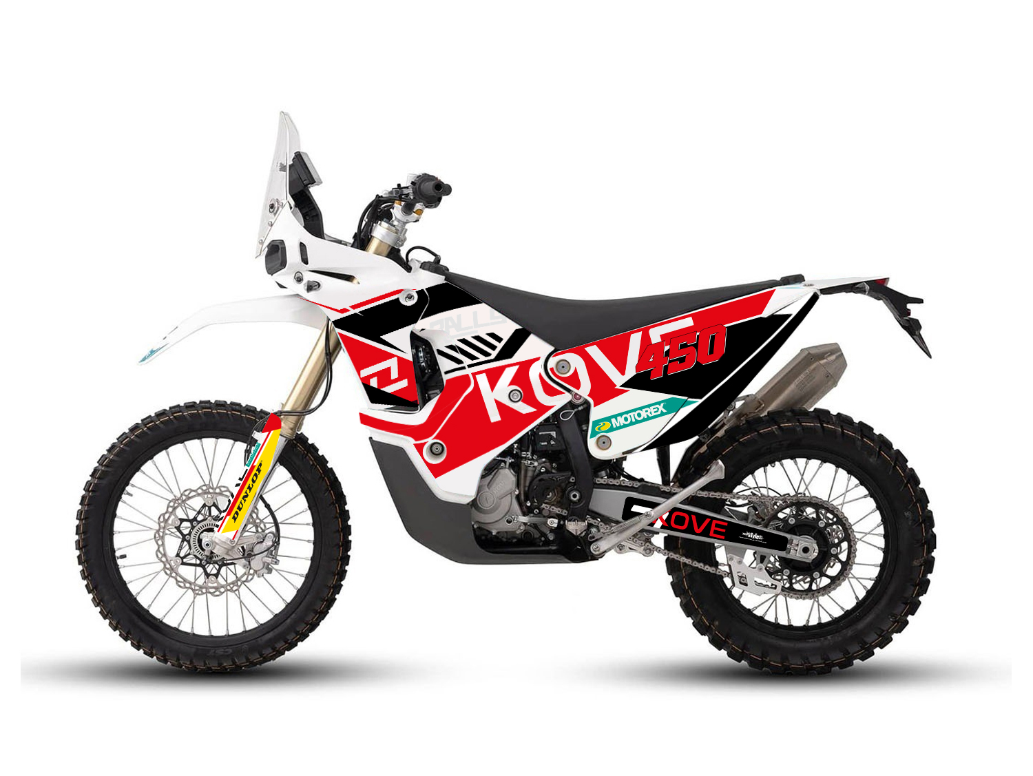Description: Full decals kit for all KOVE 450 models. This kit includes the following stickers: fork protectors le./ri., fender front/rear, rad covers le./ri., a full number plate kit and swingarm le./ri. in a RedStripes design.