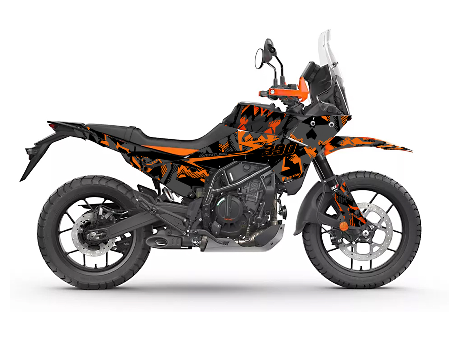 Description: Full decals kit for KTM KTM SMCR 390 / DUKE 390 / ENDURO 390 / Adventure 390 (2013-2026). This kit includes the following stickers: fork protectors le./ri., fender front/rear, rad covers le./ri. and a full number plate kit in a Camouflage design.
