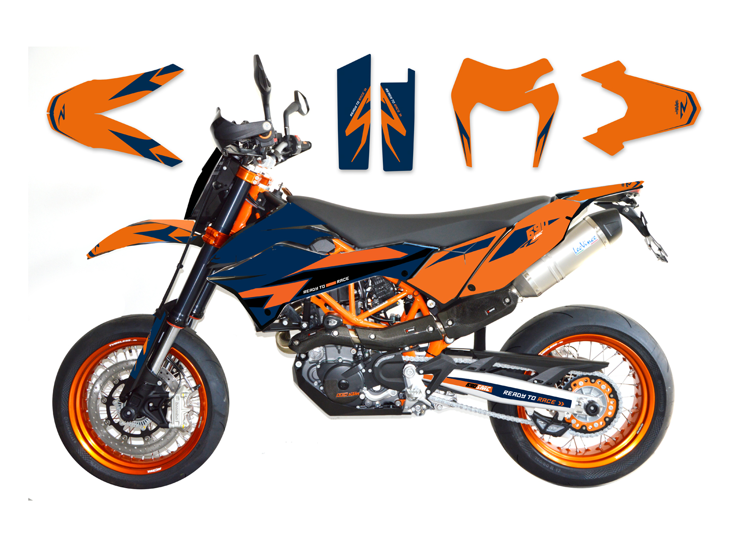 Description: full graphic KIT for KTM 690 SMC / SMC-R / ENDURO (2008-2017) models. This kit includes the following decals: fork protectors le./ri., fender front/rear, rad covers le./ri. and a full number plate kit.